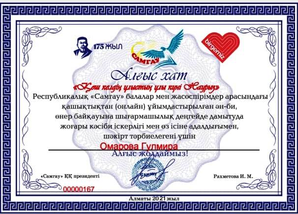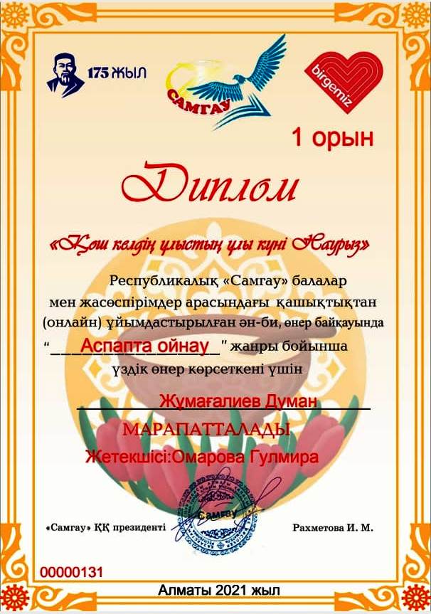 Мақат балалар өнер мектебінің «домбыра-тенор» мамандығының оқытушысы Омарова Гүлмира Қабылханқызының оқушысы Республикалық «Самғау» қоғамдық қорының ұйымдастыруымен балалар мен жасөспірімдер арасында қашықтықтан өткізген «Қош келдің ұлыстың ұлы күні Наурыз» атты өнер байқауында «аспапта ойнау» жанры бойынша үздік өнер көрсеткен Жұмағалиев Думан І орынға ие болды.